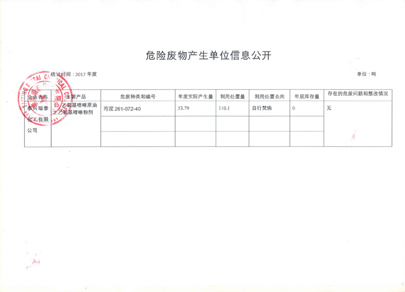 关于泰兴瑞泰化工有限公司2017年度危险废物产生单位信息公示